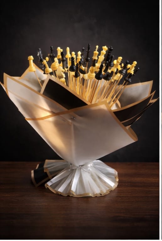 It features a creative chess theme, making it a standout alternative to traditional flower bouquets.