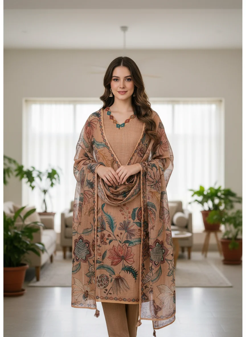 The unique V-neckline is beautifully detailed with a colorful, jewelry-like embroidered pattern, adding a touch of artisanal charm. The set includes matching solid trousers and a magnificent coordinating dupatta that features the same stunning all-over print, creating a cohesive and breathtaking look. Shop this exclusive and artistic Maa N Mee creation on Inspire Product.