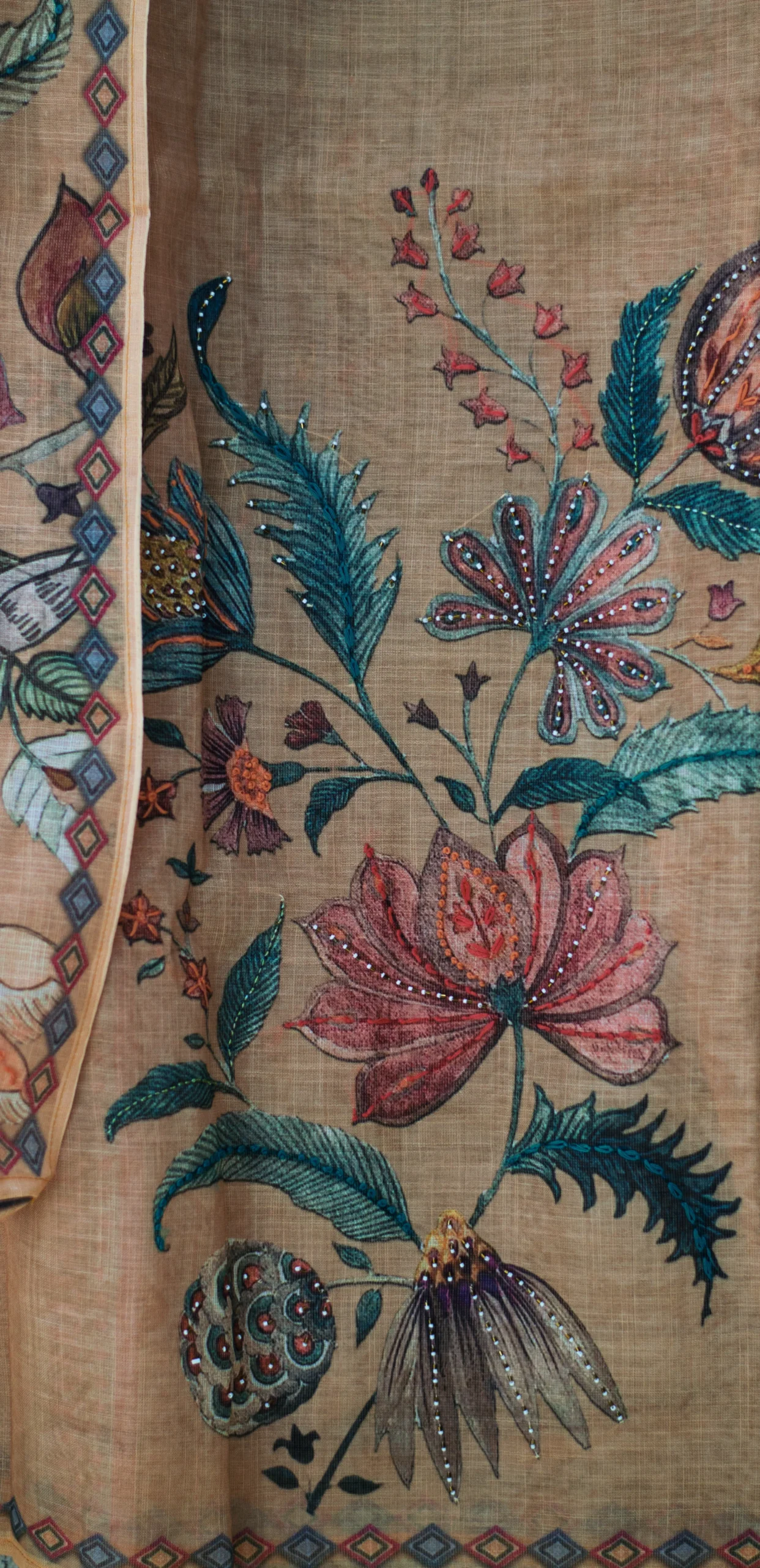 Immerse yourself in the world of heritage art with the Maa N Mee Beige Kalamkari-Style Printed Kurta Set, a truly stunning ensemble from the Inspire Product collection. This elegant three-piece set, in a sophisticated beige, is perfect for festive occasions and cultural gatherings. The straight-fit kurti is crafted from a comfortable, high-quality fabric and serves as a canvas for a magnificent, multi-colored Kalamkari-style floral print.