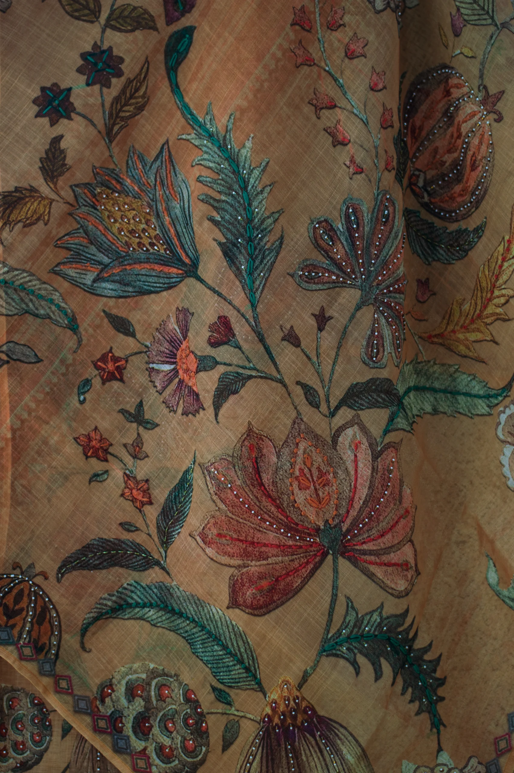 The print on this Maa N Mee kurta set is inspired by the ancient art of Kalamkari, which involves freehand drawing and block printing. This design captures the essence of this beautiful art form, creating a rich, detailed, and story-like pattern that makes this outfit a true piece of wearable art.
