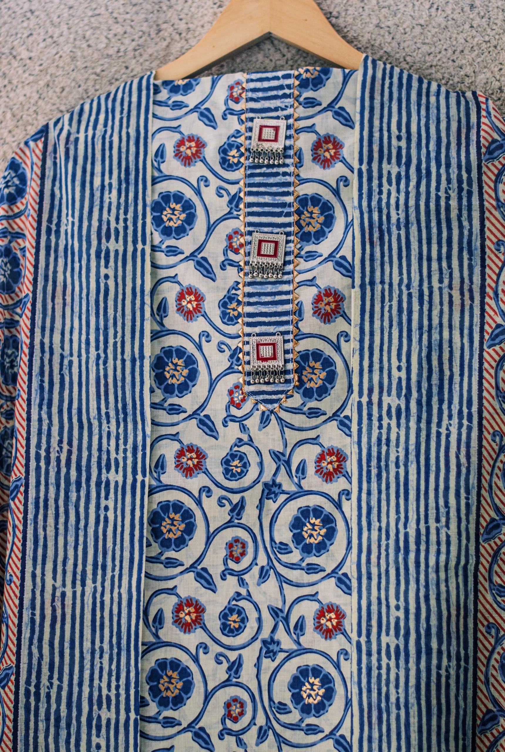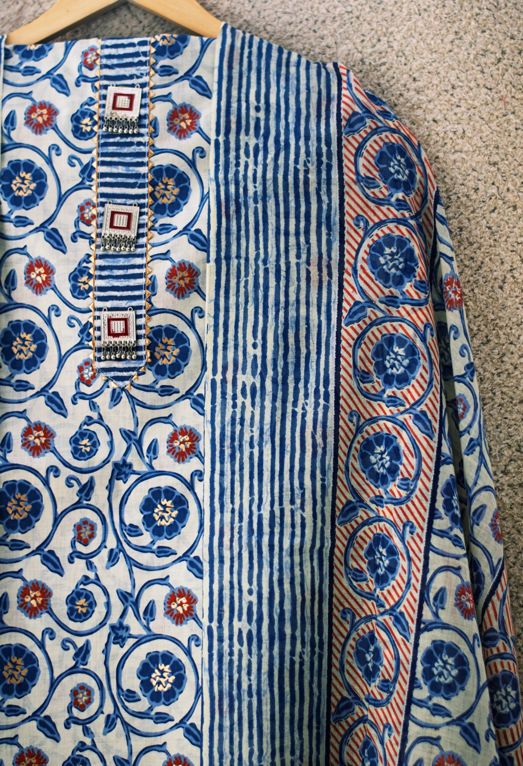 The kurti features a delightful mix of floral and striped block-print-inspired patterns in a classic blue and white color palette. A finely detailed yoke adds a touch of sophistication to this lovely piece. The set includes matching printed trousers, creating a cohesive and effortlessly stylish look. Shop this versatile and chic Maa N Mee creation on Inspire Product today.