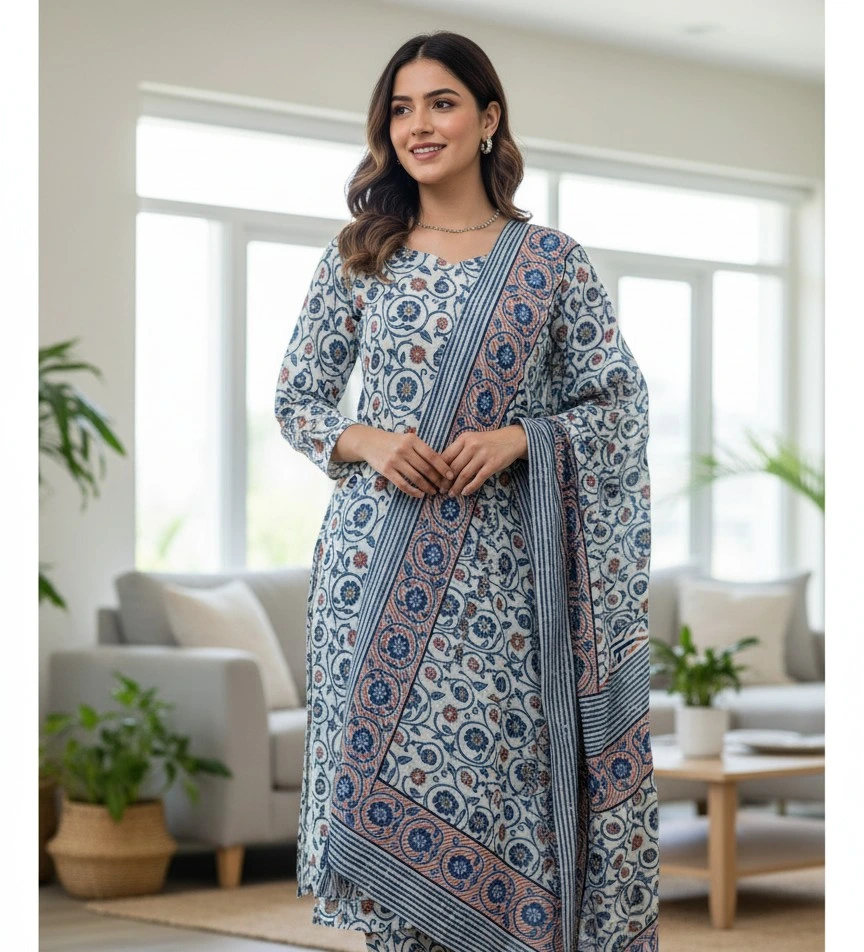Immerse yourself in the timeless charm of traditional block prints with the Maa N Mee Blue & White Printed Kurta Set, a classic and elegant addition to the Inspire Product collection. This beautiful two-piece set is perfect for everything from daily wear to casual social gatherings. The straight-fit kurti is crafted from a soft and breathable cotton fabric, ensuring you stay comfortable all day long.