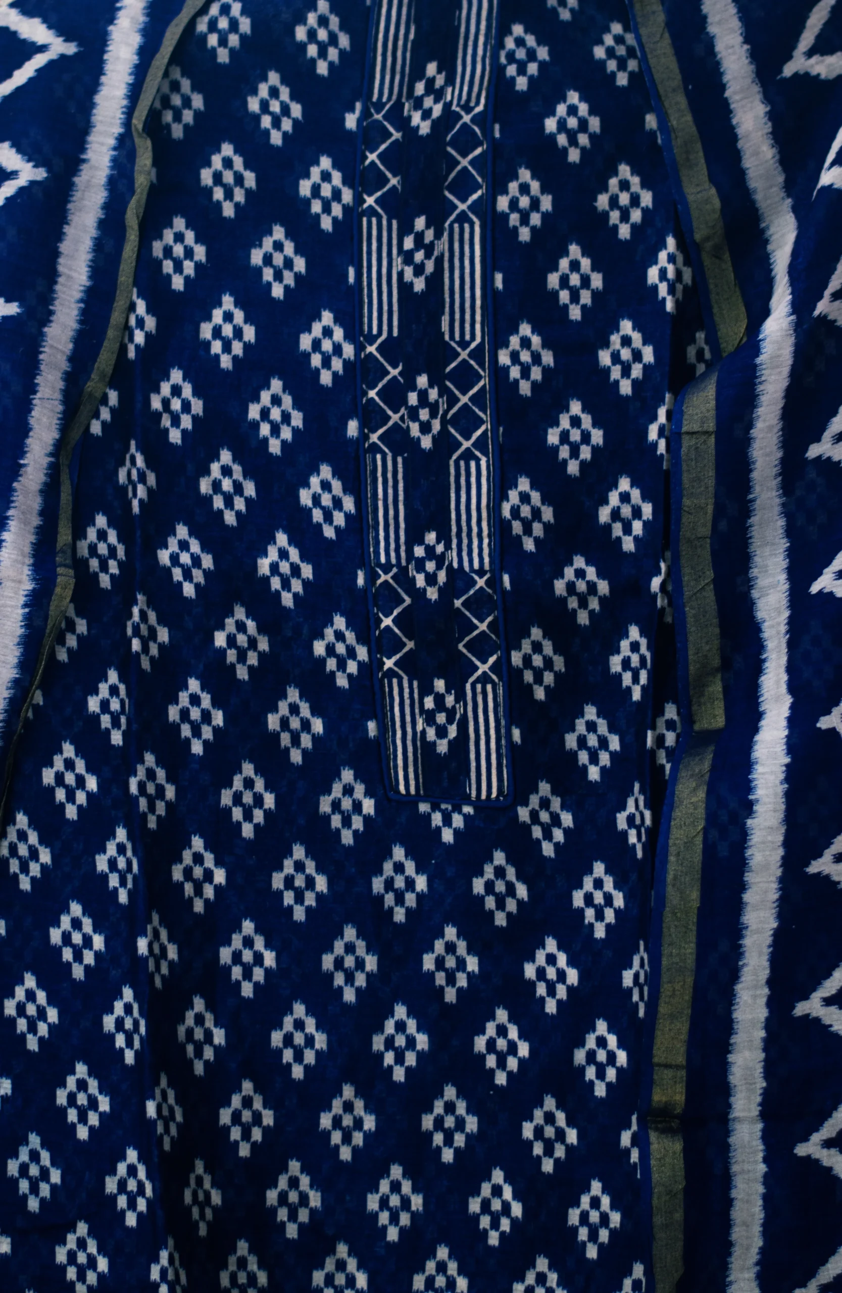 For a chic daytime look, we recommend pairing this kurta set with silver jewelry, such as jhumkas or bangles, to complement the indigo print. Complete the outfit with comfortable yet stylish footwear, like embroidered juttis or Kolhapuri sandals, for an effortlessly elegant ensemble.
