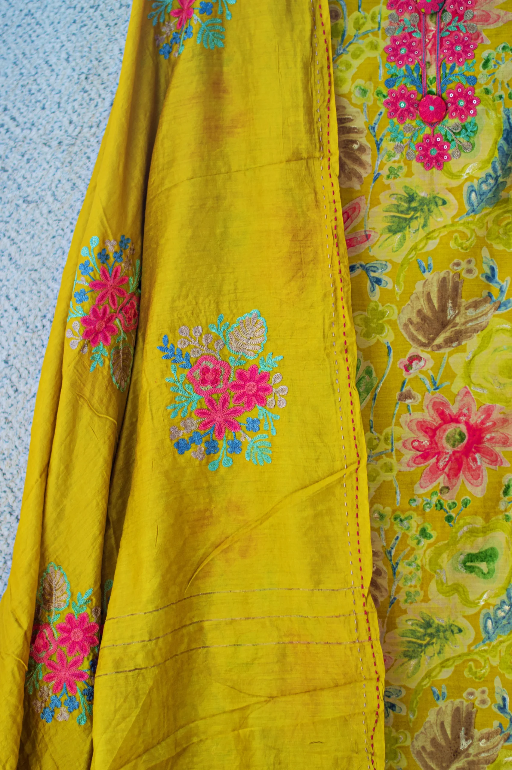 The Maa N Mee Mustard Floral Kurta Set features a beautiful combination of digital floral printing across the body of the kurti and intricate, multi-colored floral thread embroidery that elegantly highlights the neckline. The matching dupatta also showcases this lovely embroidery on its ends, tying the whole look together.