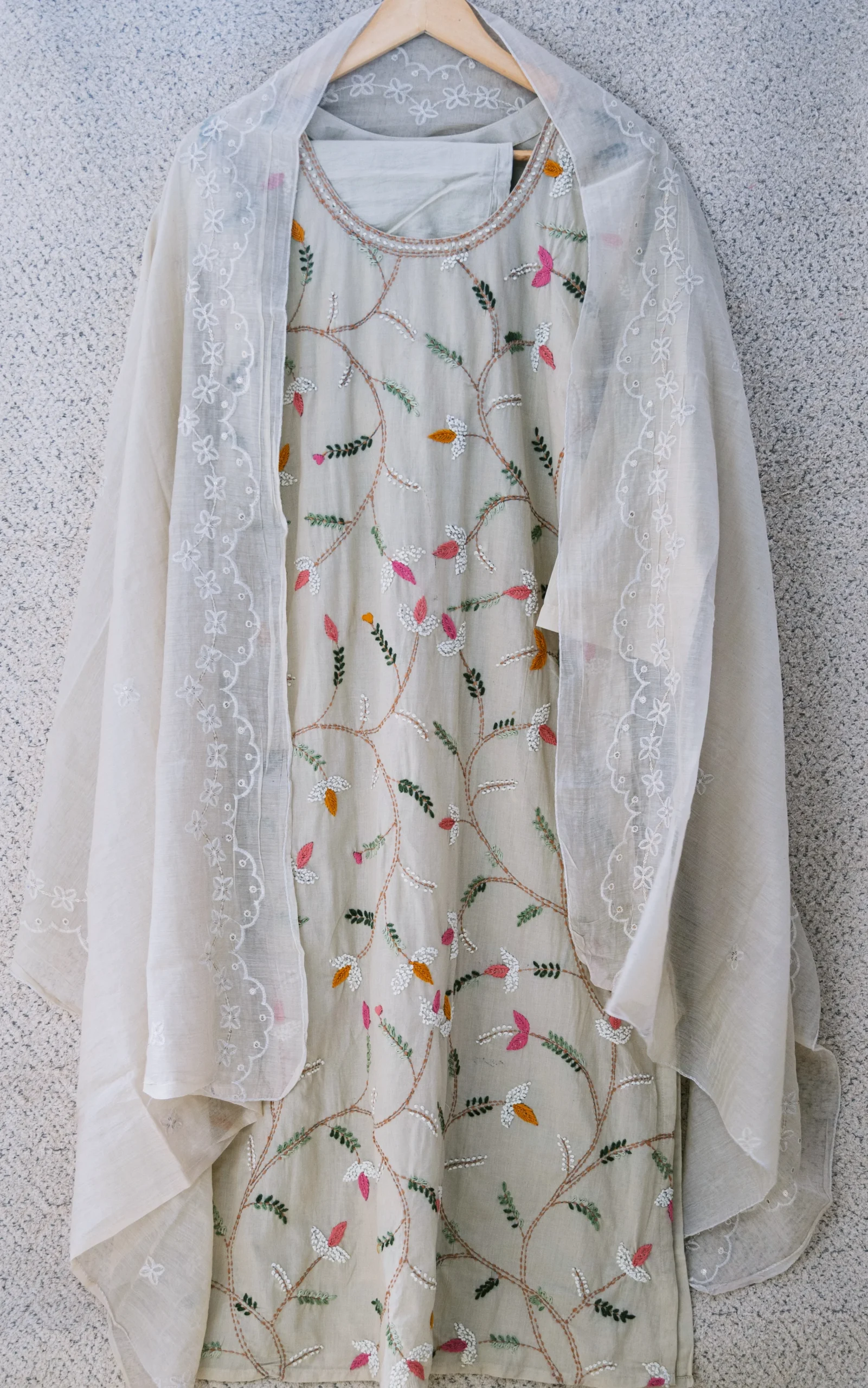 This Maa N Mee kurta set is a celebration of nature’s beauty, featuring an exquisite all-over floral vine embroidery that creates a sense of harmony and grace. The delicate, multi-colored threadwork on the serene off-white base makes this a truly special and artistic piece, perfect for creating memorable moments.