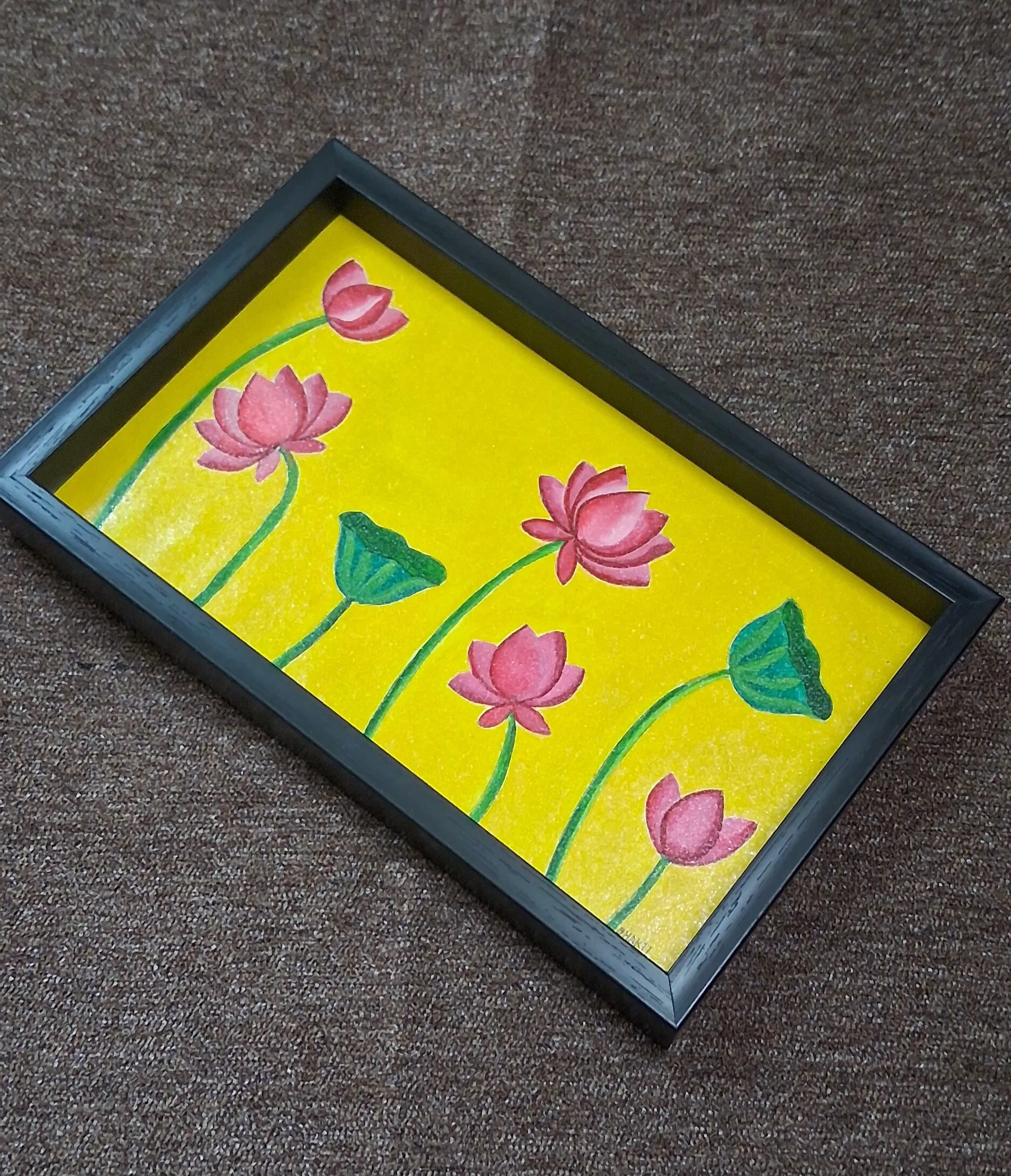 Add a burst of sunshine to your home with this Handmade Pink Lotus Wooden Tray, featuring elegant hand-painted pink lotuses with lush green leaves set against a vibrant yellow background. The lively contrast between the expressive blossoms and the bold base color brings cheer and energy to any space, making this tray both a stunning centerpiece and a functional piece of serveware.