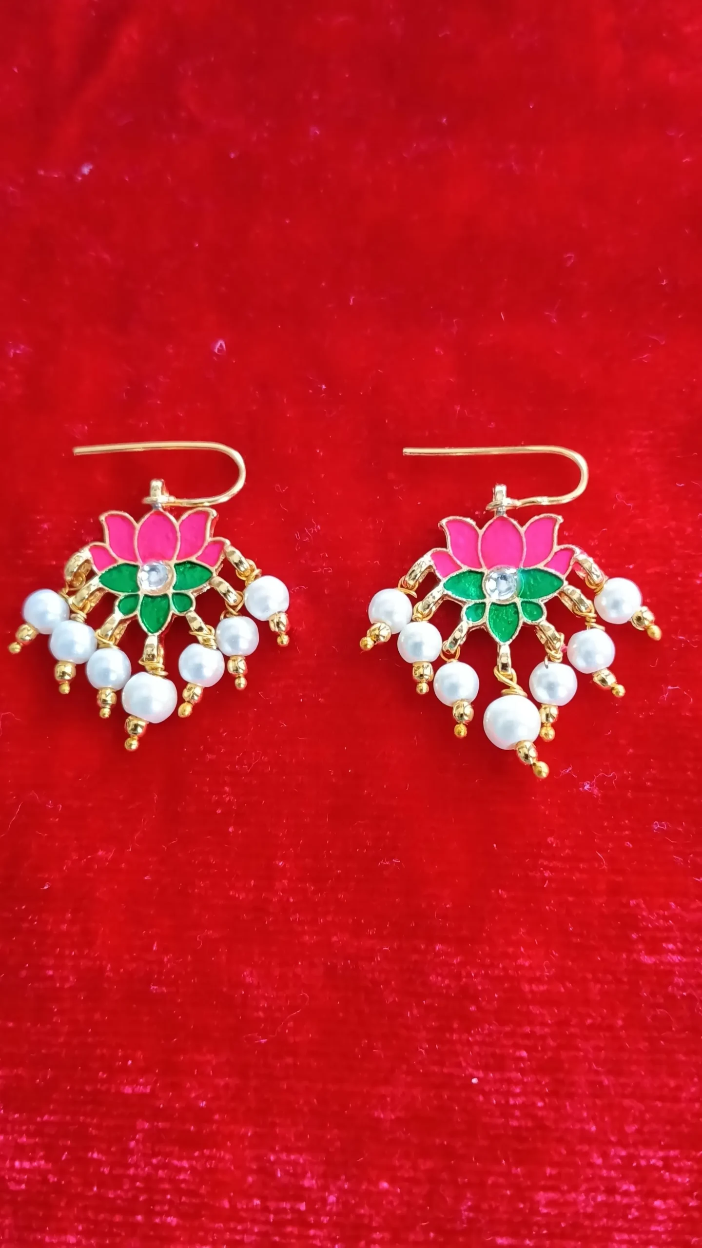 Enhance your festive and ethnic wardrobe with the stunning ShreeDa Pink Lotus Meenakari Pearl Drop Earrings, crafted with bright meenakari lotus petals, a central sparkling stone, and delicate pearl droplets. These earrings add a graceful traditional touch, making them ideal for pairing with sarees, kurtis, and lehengas.