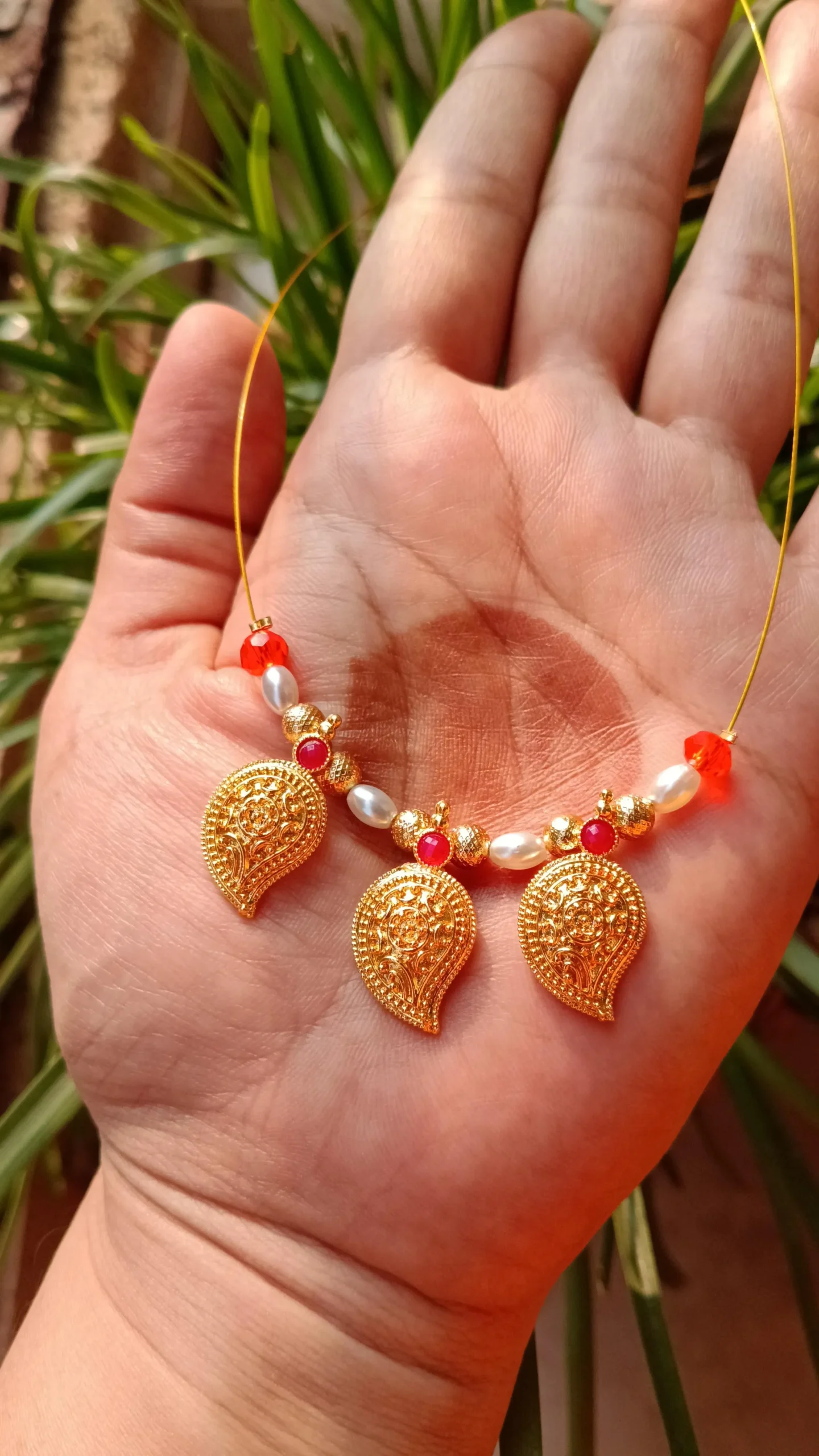 Its invisible wire design combined with mango-shaped pendants and pearl-crystal detailing gives it a refined traditional look with modern comfort.