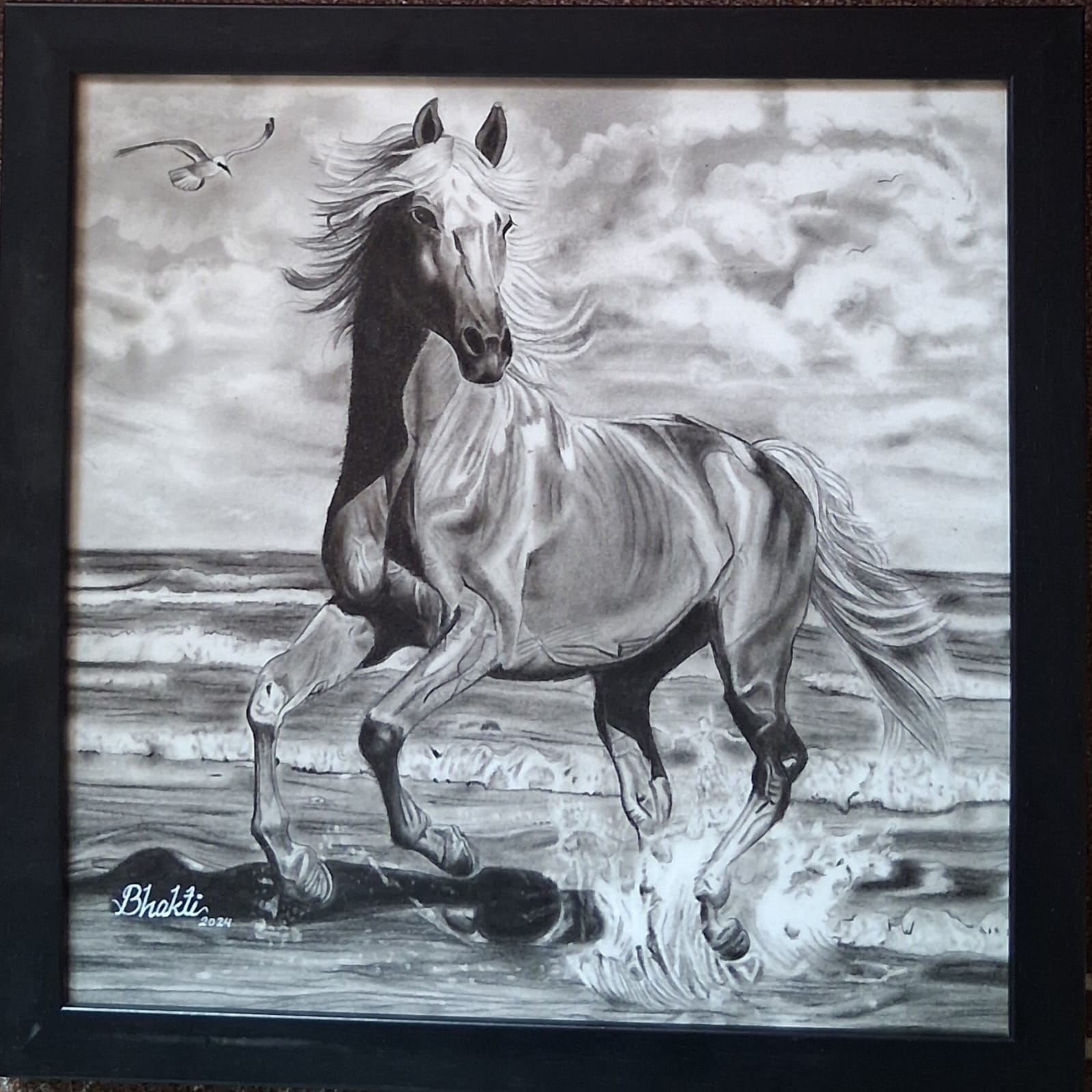 Spirit Horse is a striking charcoal artwork that embodies freedom, resilience, and raw natural energy. The horse, captured mid-stride against crashing waves and open skies, symbolizes independence and unstoppable spirit. Every charcoal stroke highlights muscular movement, flowing mane, and the dynamic interaction between land, water, and motion.