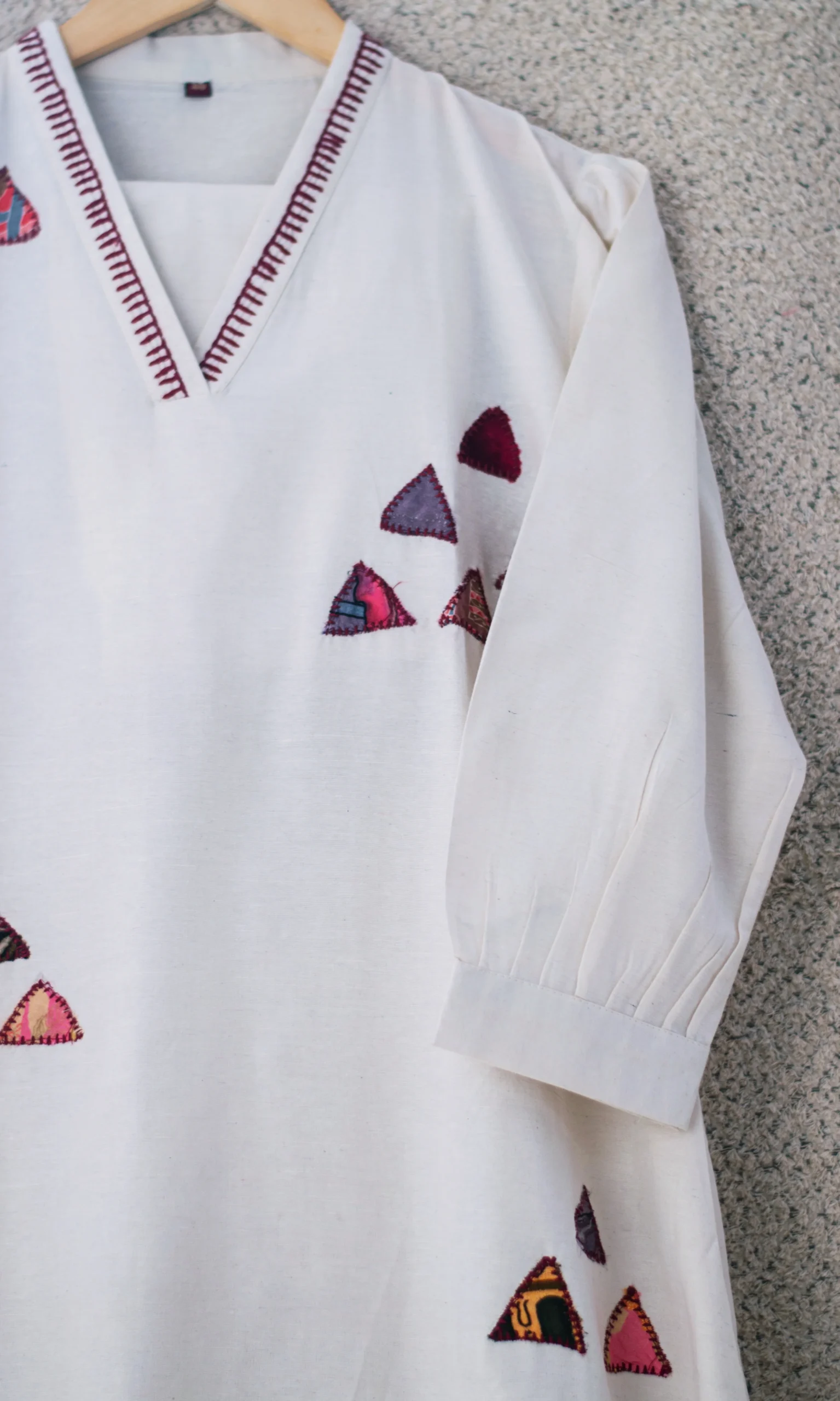 This Maa N Mee kurta is inspired by contemporary art, translating modern geometric shapes into a beautiful and playful appliqué design. It’s a wonderful celebration of creativity, perfect for the woman who loves to express her unique personality through fashion.